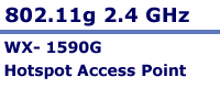 WX-1590G 802.11g 54Mbps Hotspot Access Point SparkLAN WX-1590G Wireless 11g Hotspot Access Point is a single LAN port access point operating in 2.4GHz band. WX-1590G is backward compatible with all other 802.11b devices and its performance enhanced technology provides better throughput than regular 802.11g devices. Due to its multi-function and advanced security features, WX-1590G can be a suitable choice for enterprise and public access solutions. WX-1590G has built-in DHCP server enable/disable and can support three different operating modes using the wireless distribution system feature for simple wireless network setup or wireless coverage extension. There are 4 levels of output power. Users can program the output power to the desired level for better wireless communication coverage. WX-1590G includes WEP Encryption and WPA to protect your wireless data privacy. Internal 802.1x RADIUS client supports external RADIUS network authentication, which is an advanced option for enterprise and public network access security requirement. WX-1590G also provide other special features like IAPP, seamless roaming from access point to access point and layer 2 isolation to protect log-in user’s on-line privacy. The help menu is easy for user to access during configuration, which is simple following the web-based configuration utility Benefits and Features: